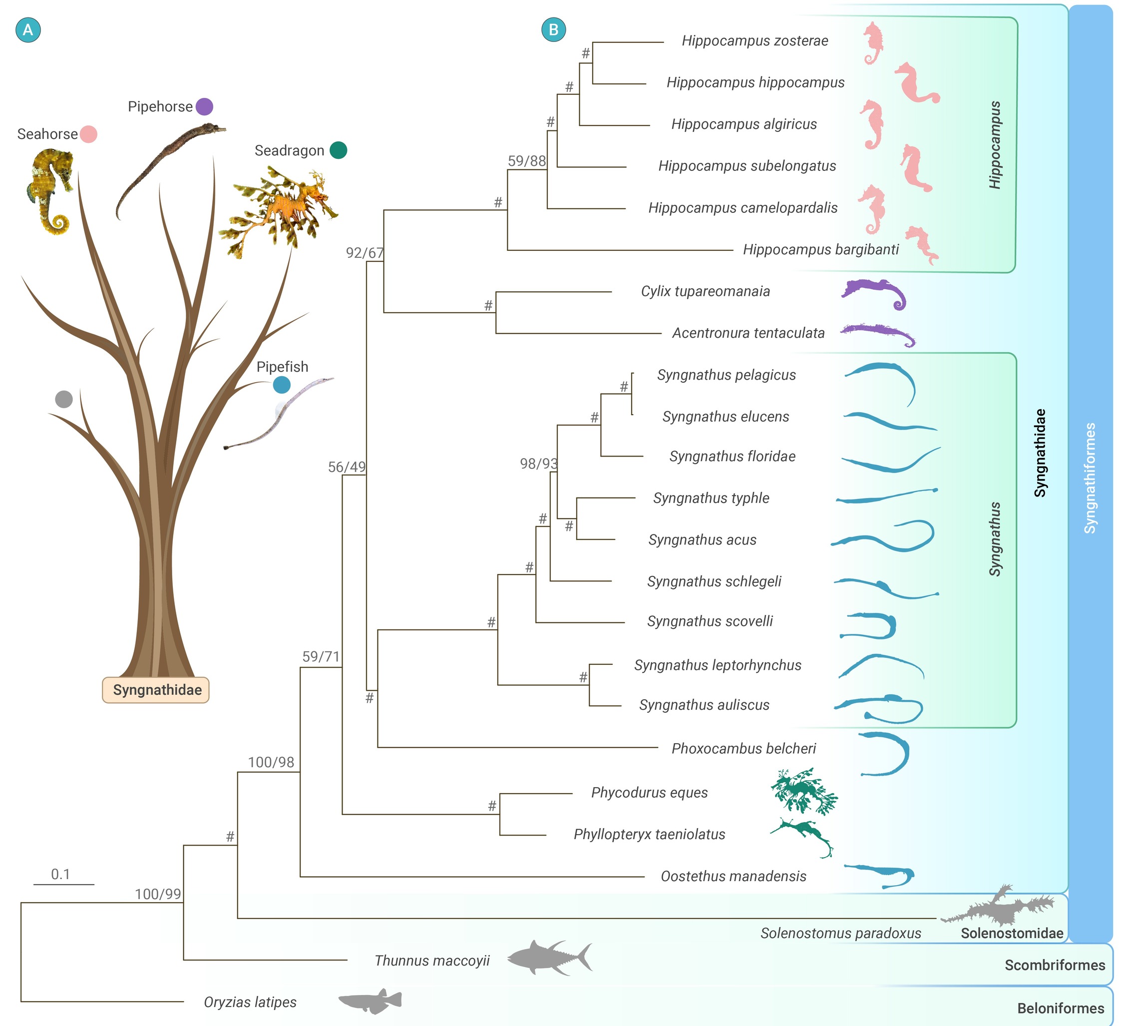 Ancestral state estimation and phylogenetic analyses across seahorse, pipehorse, pipefish, and seadragon within Syngnathidae