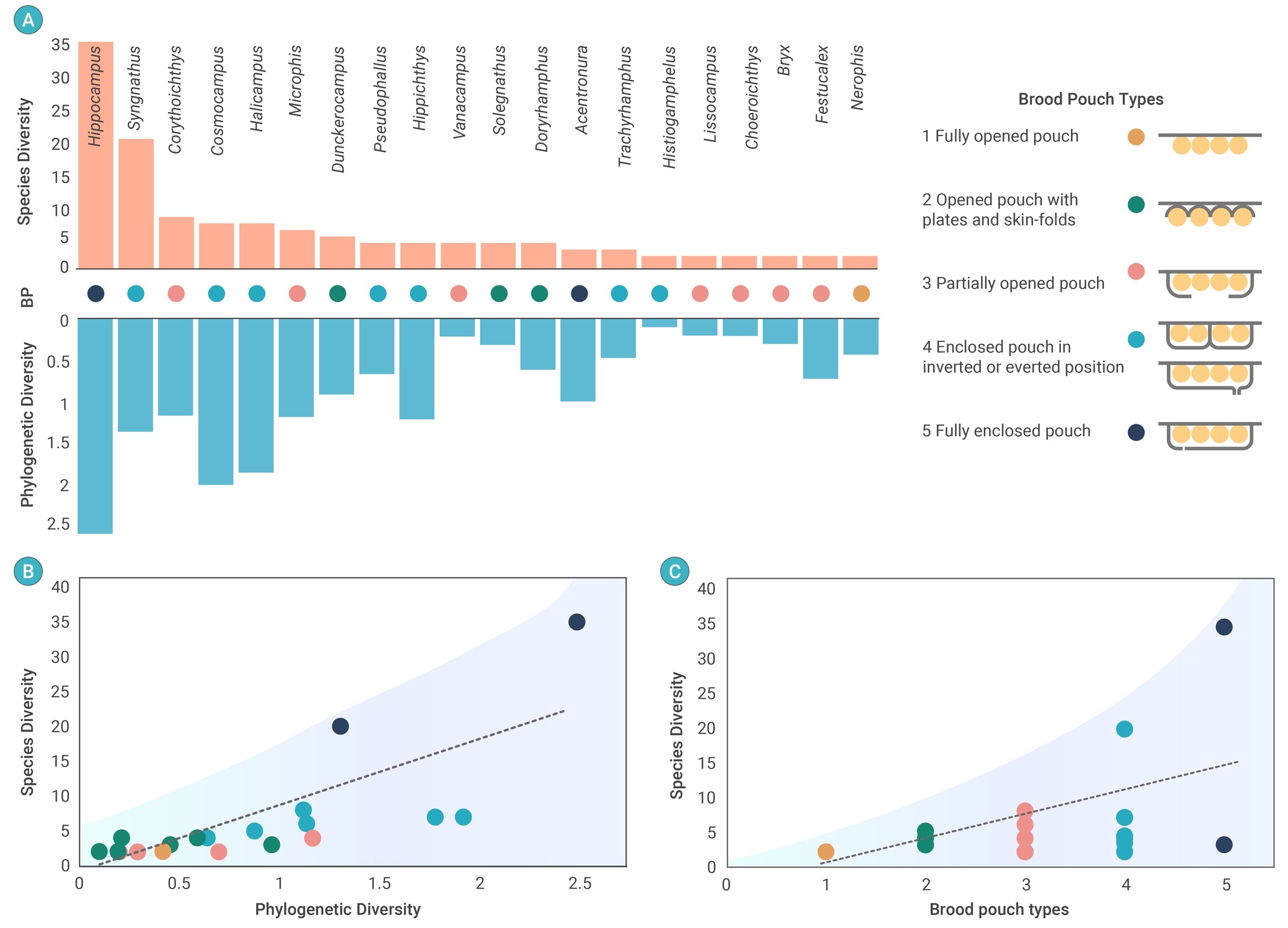 Enclosed brood pouches boost syngnathid reproductive success, driving their biodiversity and global dispersal.