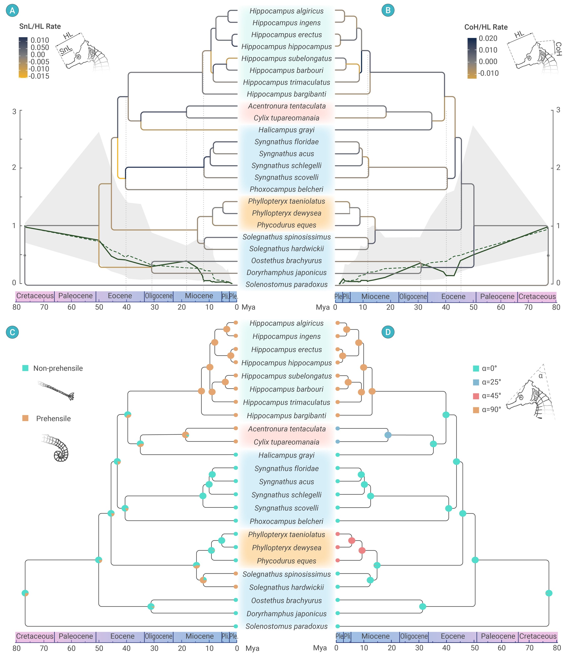 Repeated evolution of prehensile tails and angled heads reflect coral reef specialization.