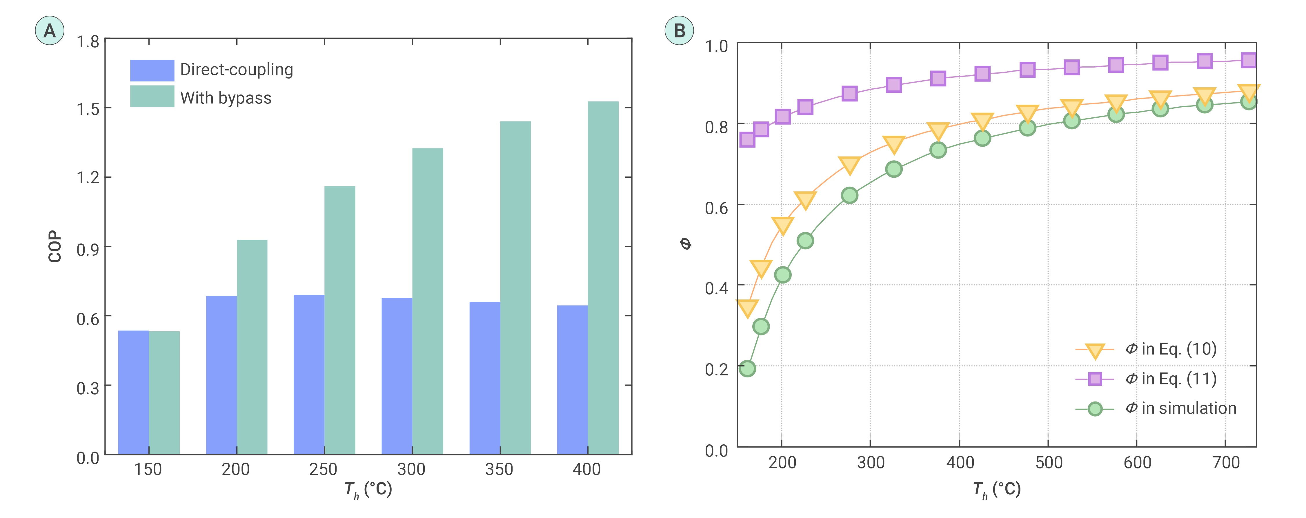 (A) COP comparison between the proposed novel HDTR and the direct-coupling HDTR without bypass (simulation results). (B) Theoretical and simulated results of bypass proportion