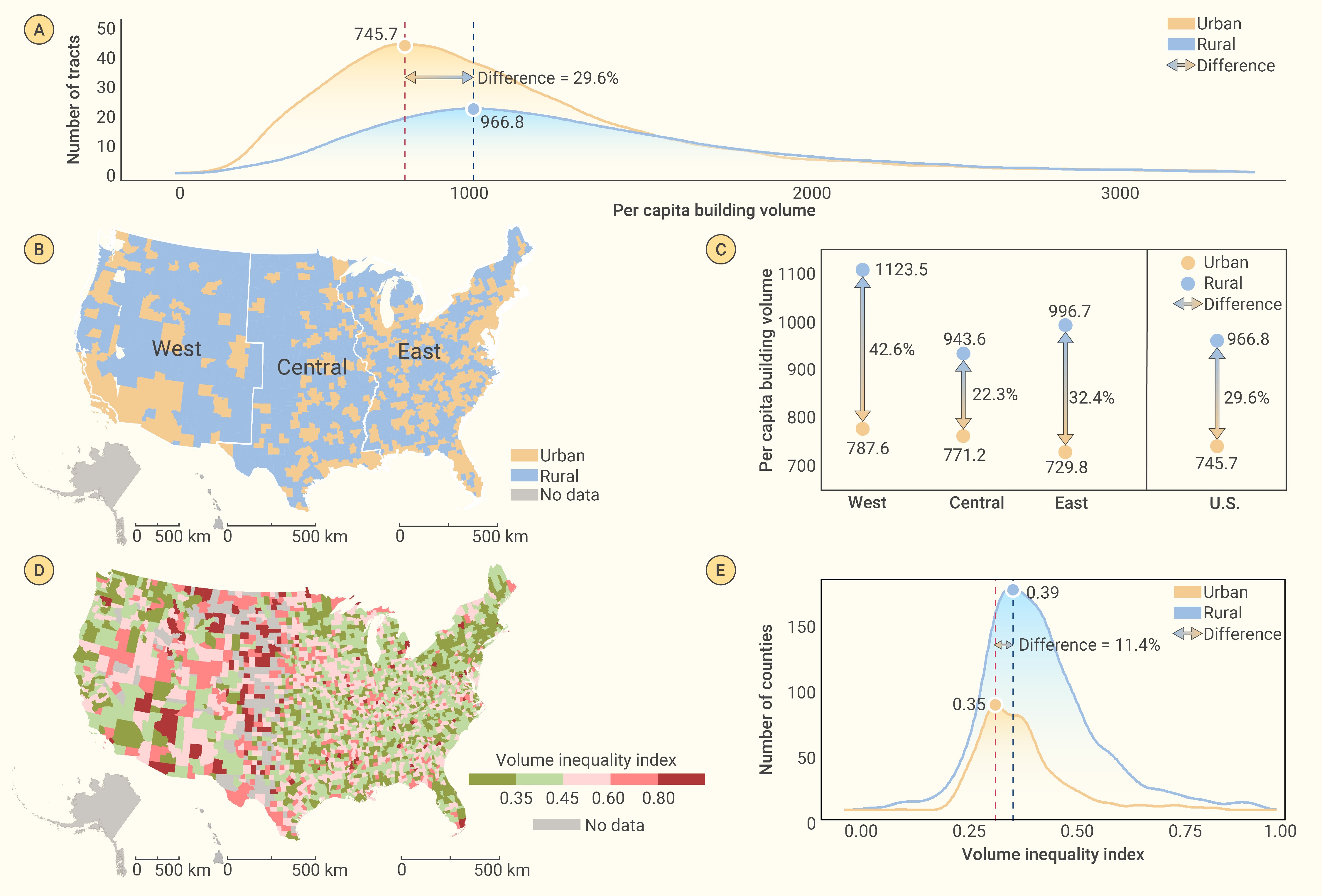 Comparison of per capita building volume and inequality between urban and rural areas