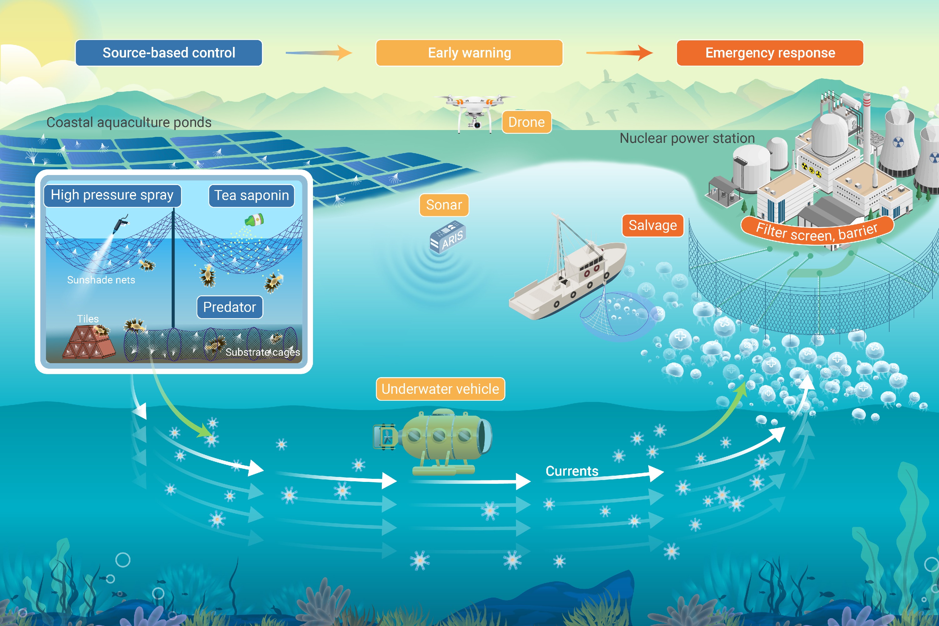 The integrated three-tiered jellyfish prevention system, including source-based control, early warning, and emergency response systems.