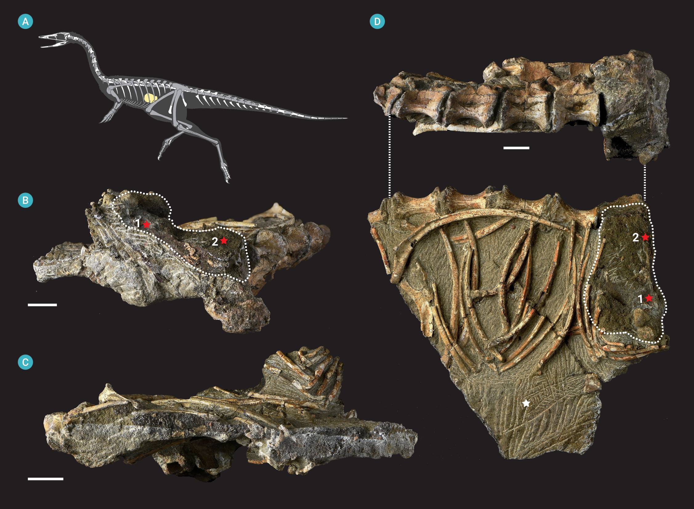 Silhouette and photographs of Bannykus wulatensis holotype (IVPP V25026) showing the yellowish conglomerate enclosed by the partial gastralia ribcage