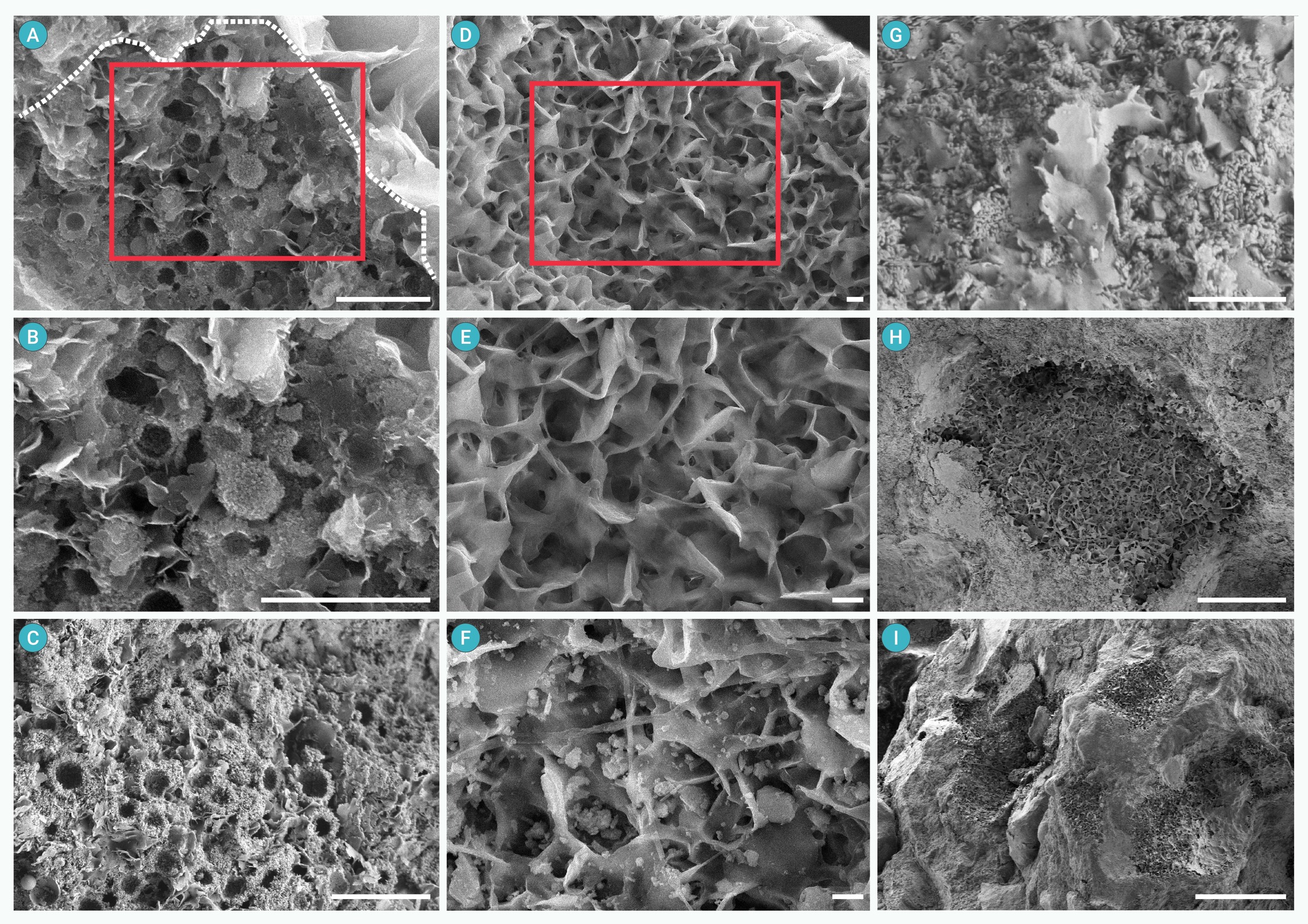 SEM images showing the phosphatized hollow microspheres (A-C), apatite crystals (D-F), and phosphatized microbes (G), illustrating the heterogeneous nature of the conglomerate (H-I)