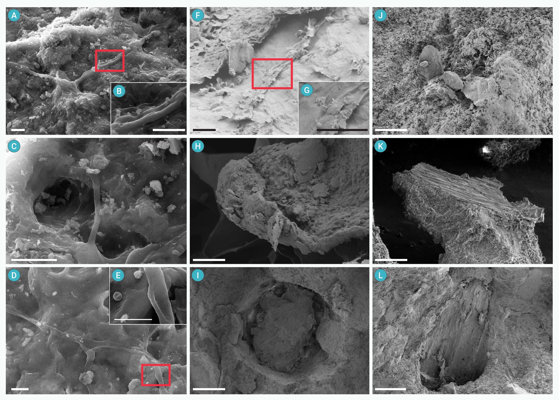 SEM images showing the phosphatized soft tissues (A-I) and debris of hard tissues (J-L) within the intestinal contents