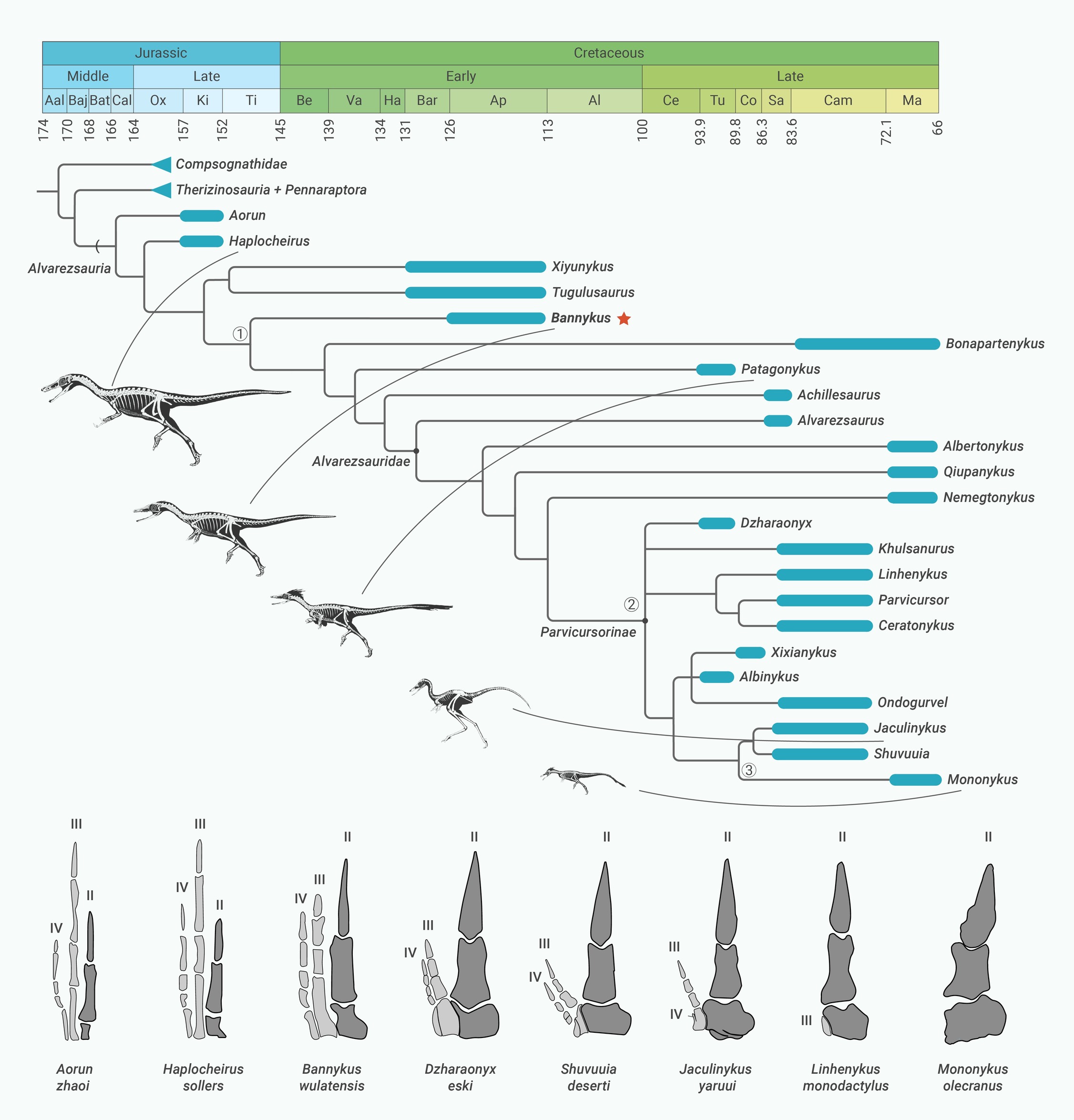 Time-calibrated simplified phylogeny showing the interrelationships of alvarezsaurians, along with the accompanying decreases in body size and the reduction of manual digits (not to scale)