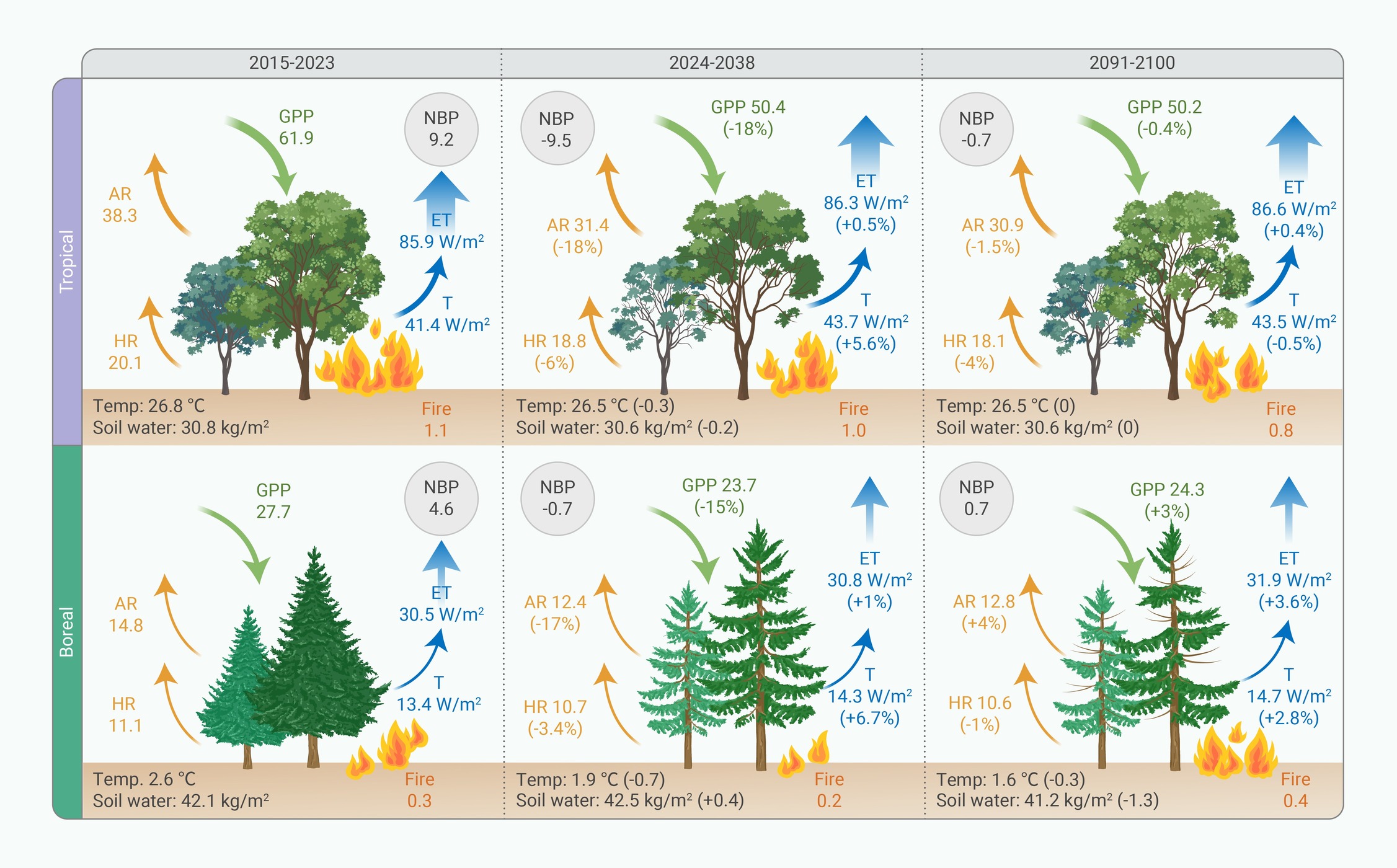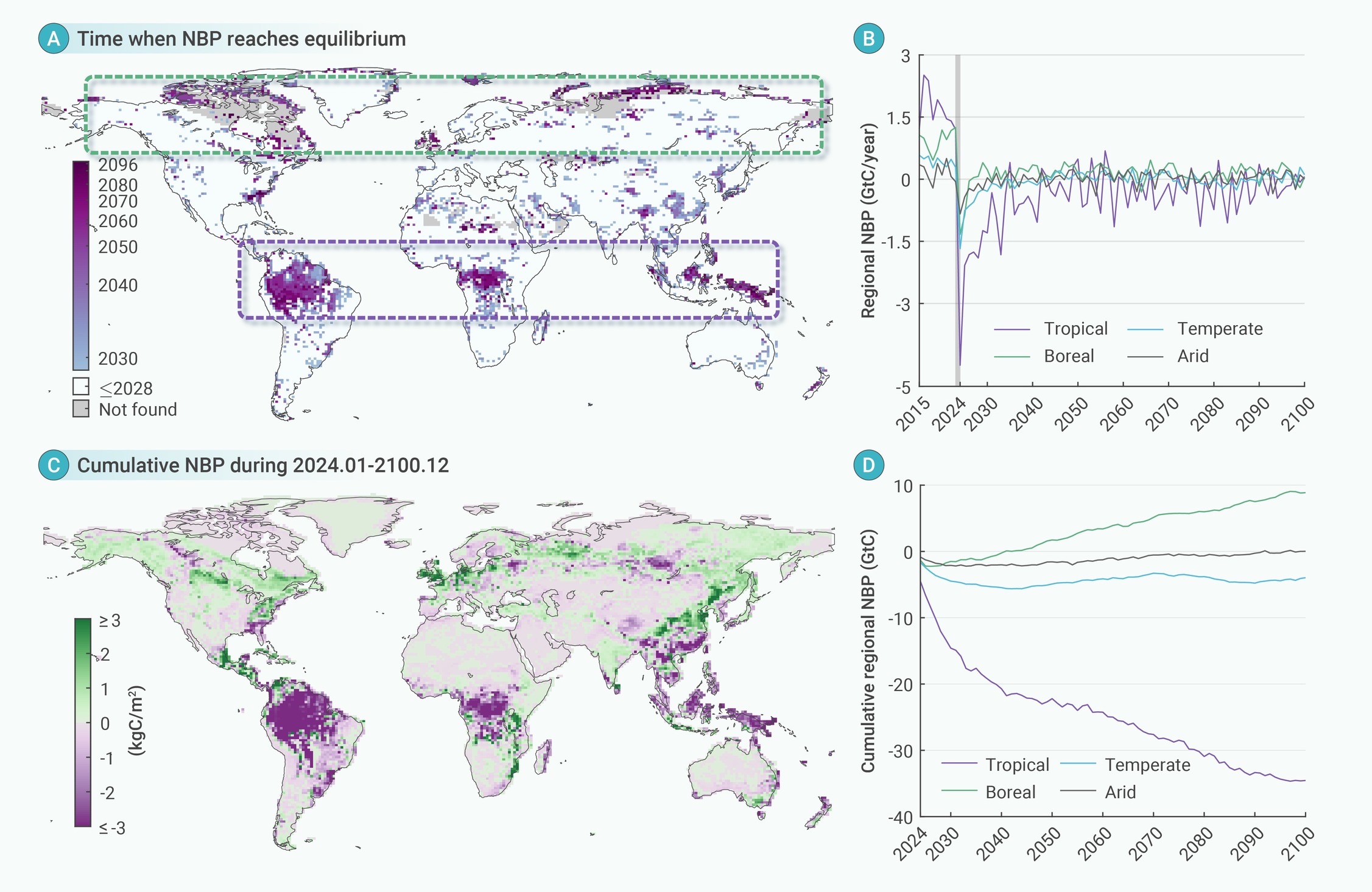 Boreal forests help restore global land carbon balance while tropics remain CO2 sources.