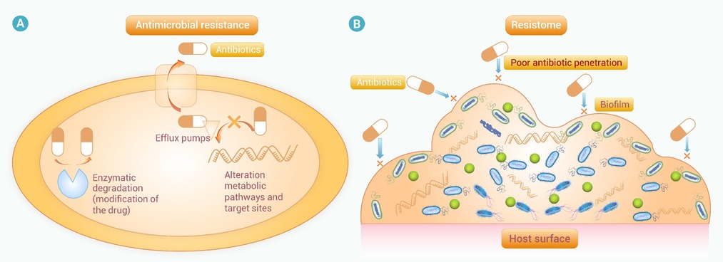 The illustration of antimicrobial resistance of single microorganism (A) and resistome (B) from microbiome in the biofilm.